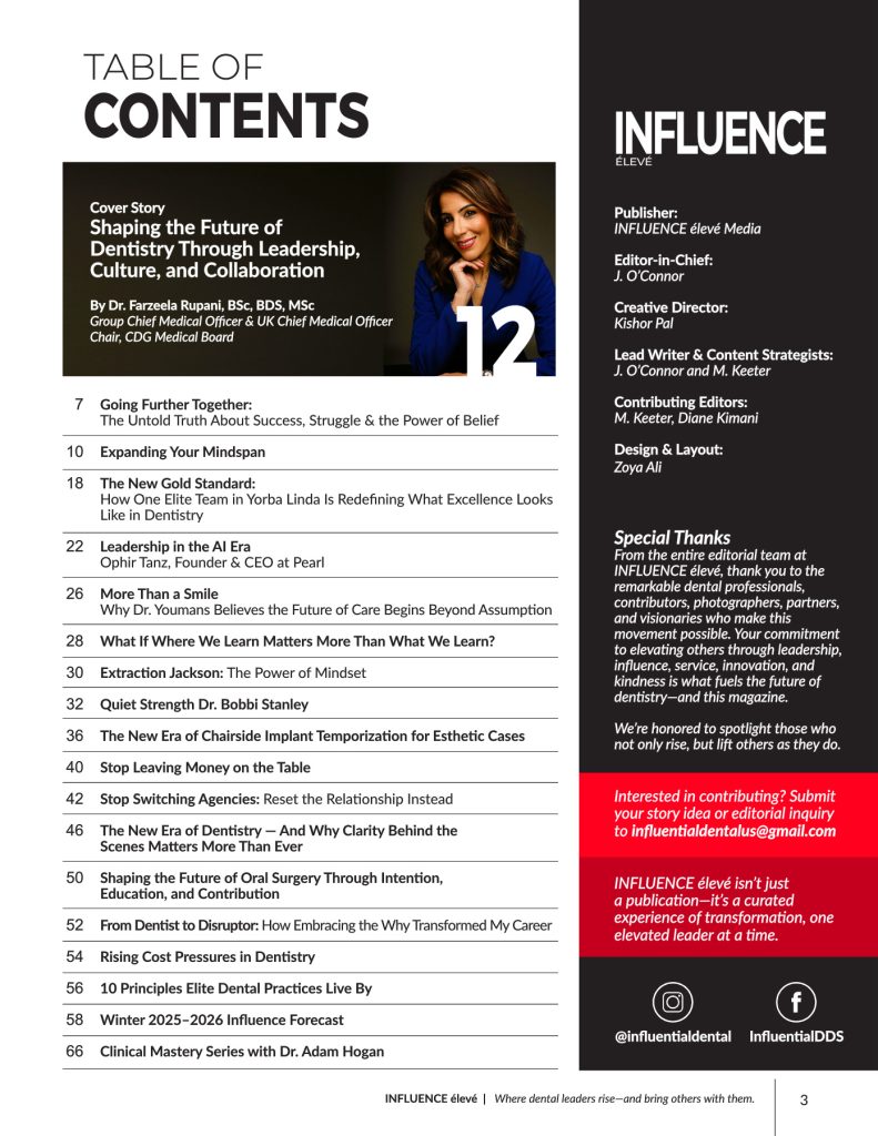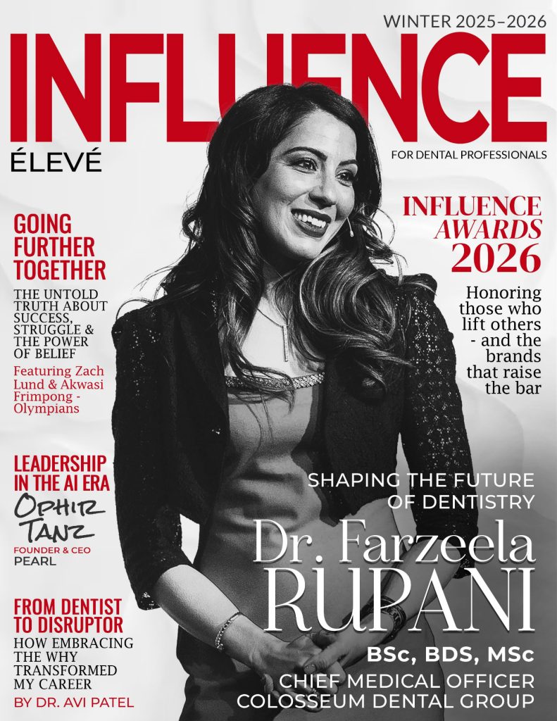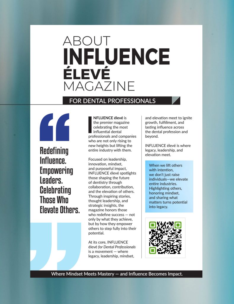 Focused on leadership, innovation, mindset, and purposeful impact, INFLUENCE élevé spotlights those shaping the future of dentistry through collaboration, contribution, and the elevation of others. Through inspiring stories, thought leadership, and strategic insights, the magazine honors those who redefine success — not only by what they achieve, but by how they empower others to step fully into their potential.